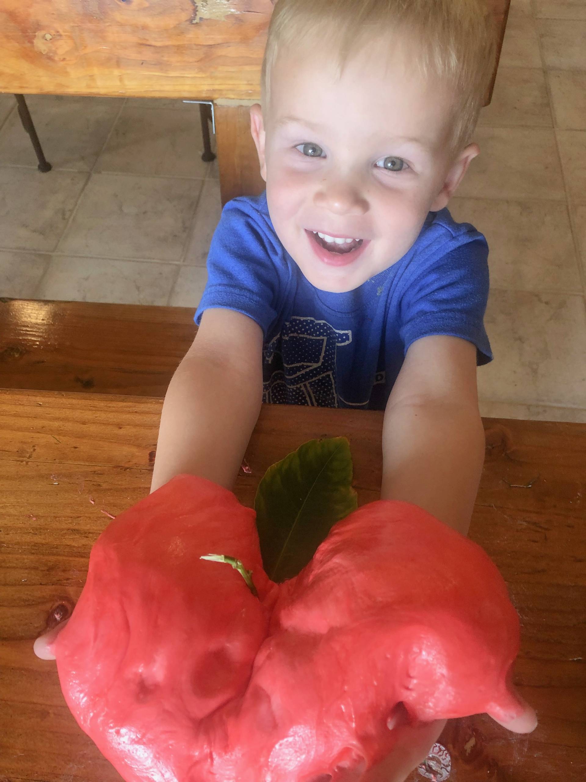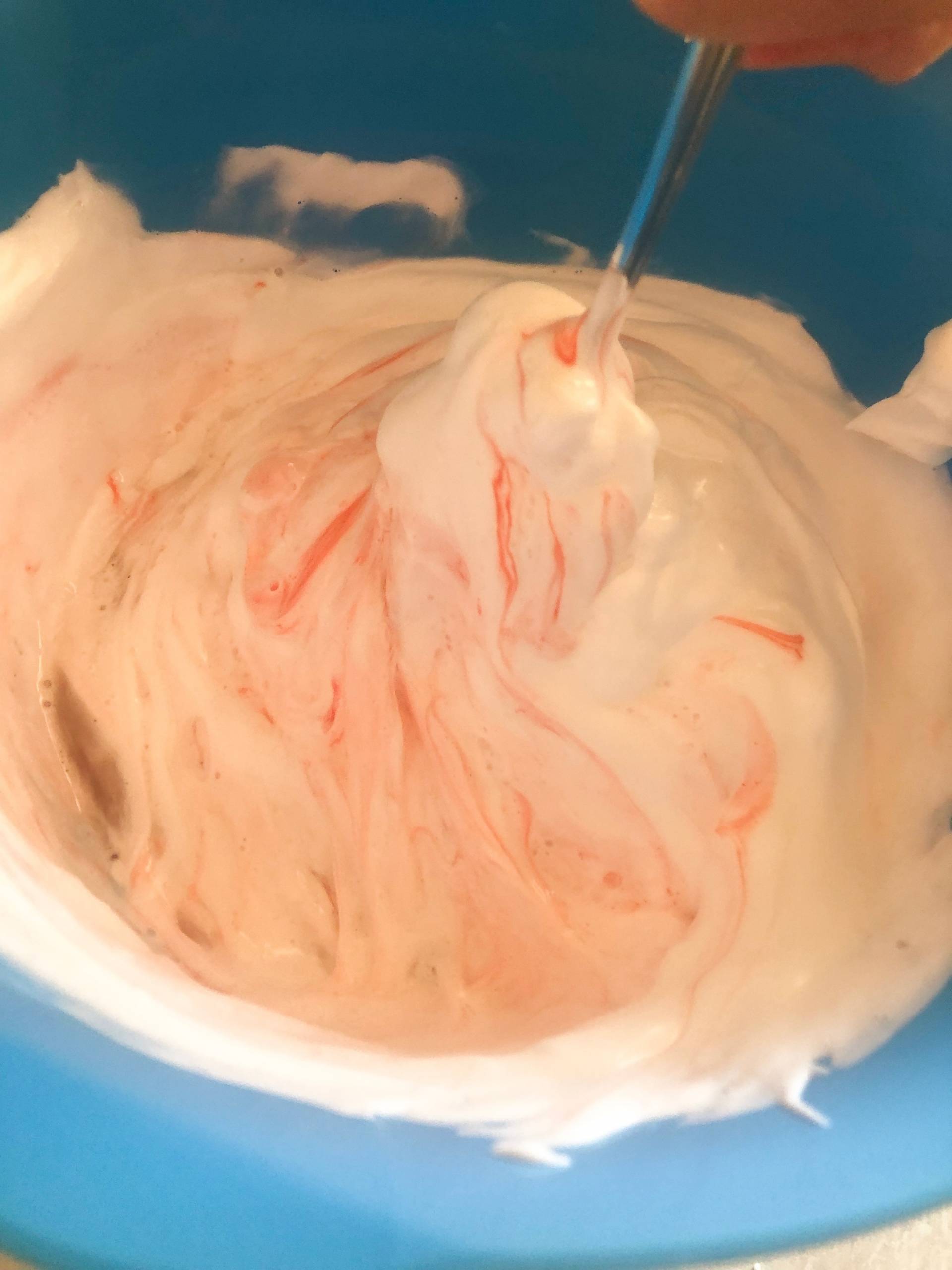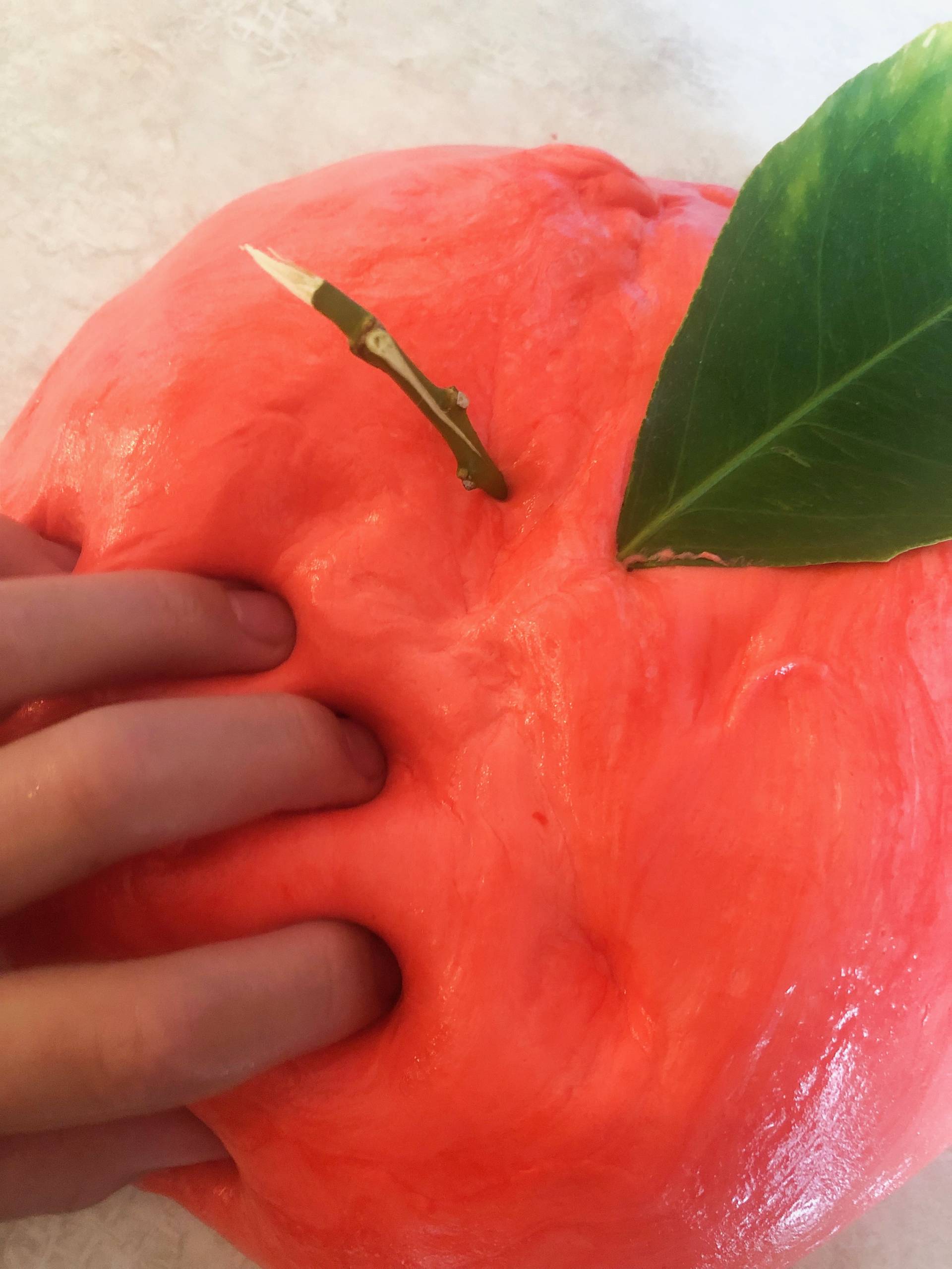 Our food coloring made our “apple” look more pink, so we decided that we had a Pink Lady apple! It was such a cool consistency to play with, having added the shaving cream. We put it into a container afterwards to pull out for another afternoon of slime fun!