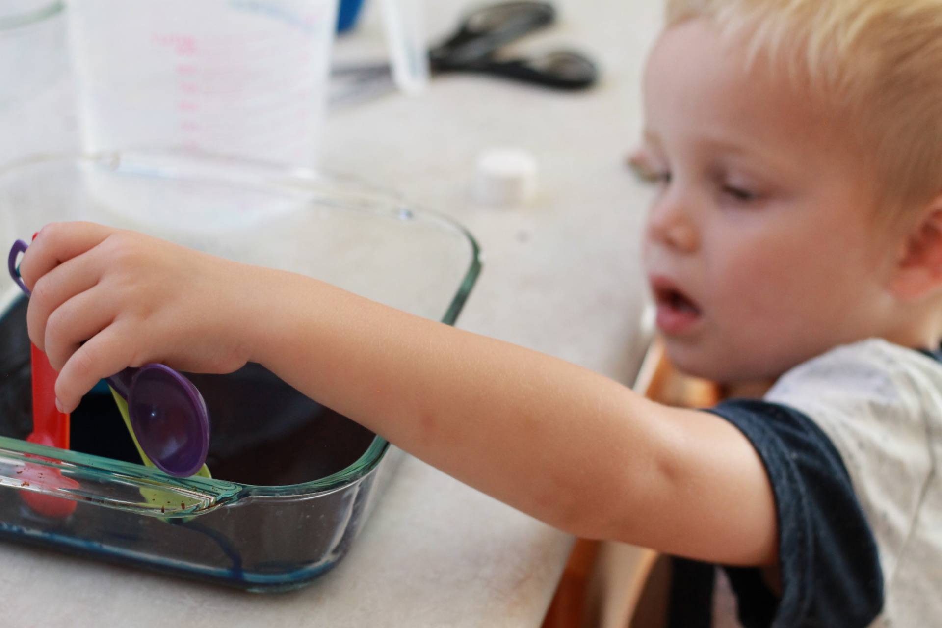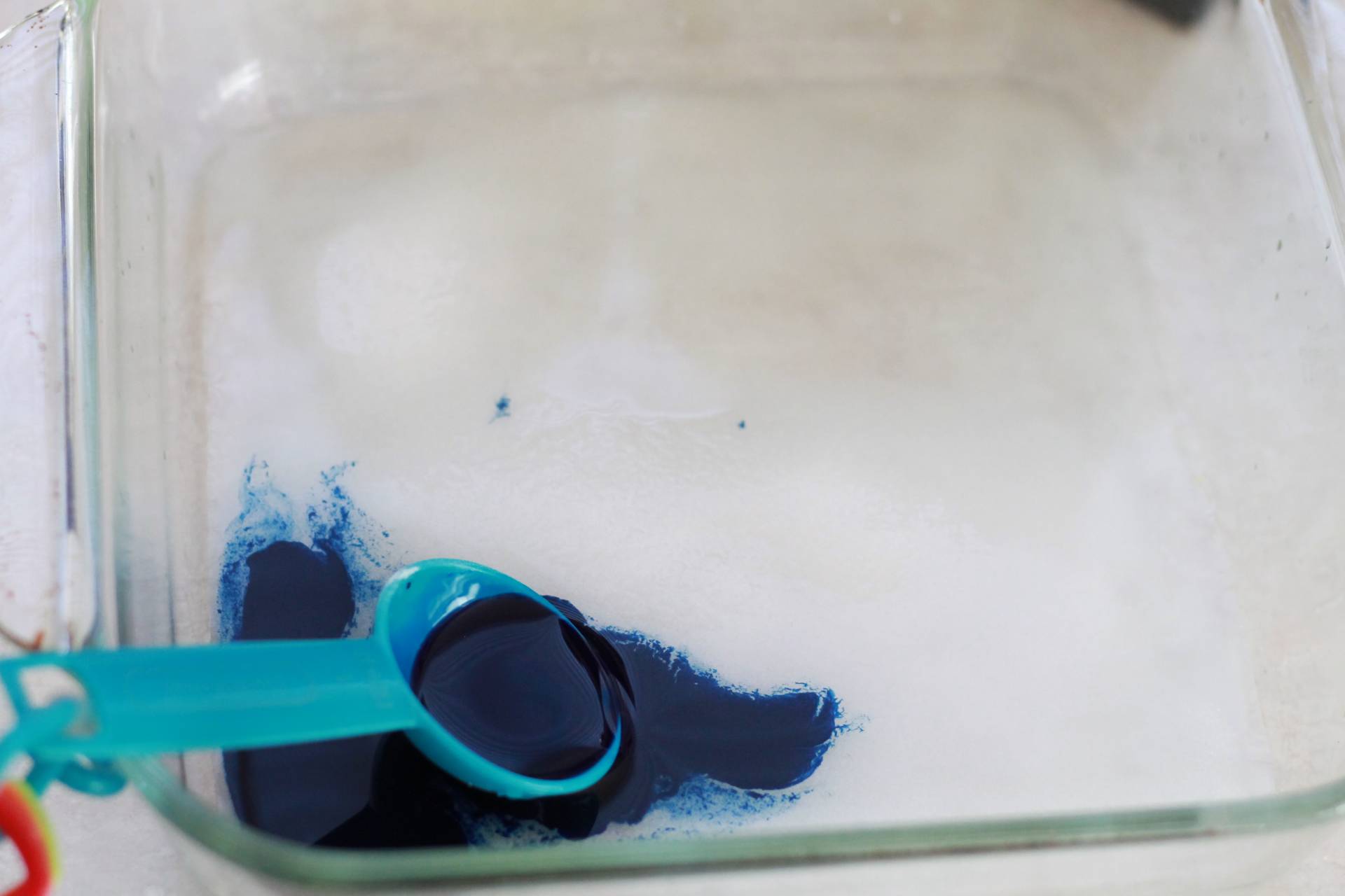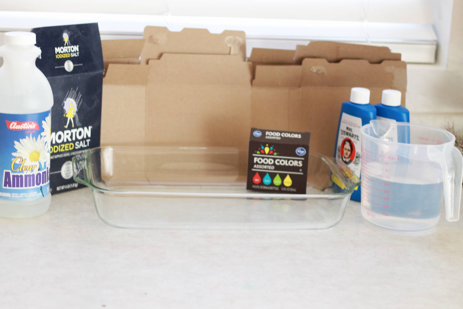 We made our crystal making solution next. We used 4 Tablespoons of warm water, 4 Tablespoons table salt, 4 Tablespoons Mrs. Stewart’s Bluing, 2 Tablespoons ammonia. Place in bottom of dish.