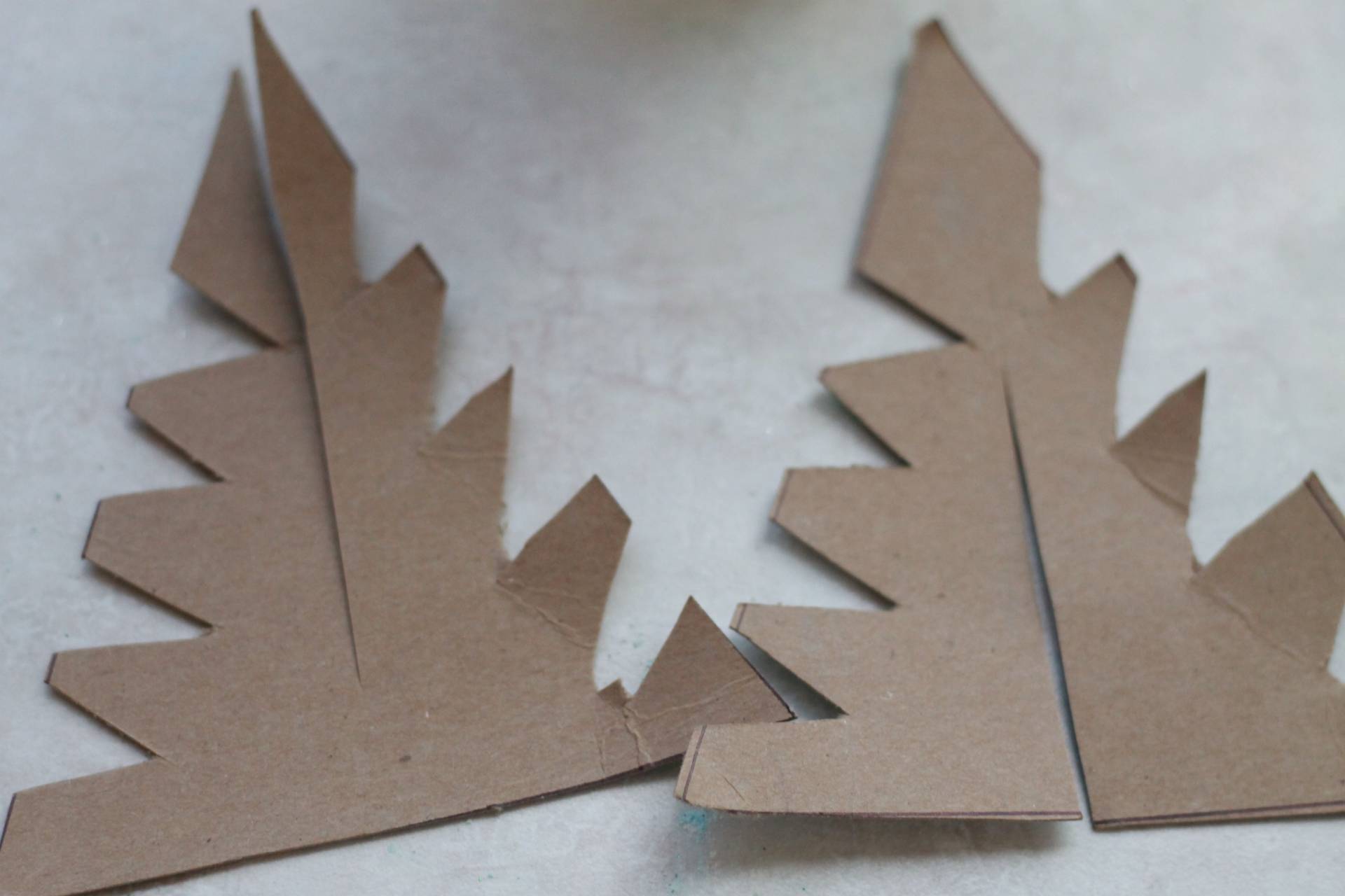 Trace and cut out the trees. I used a straight edge and made a few small trees. Once cut out, I put two together to match cutting branches. Once that was done, I cut two notches – one on top of one tree, one on the bottom of the other so that they could slide together.