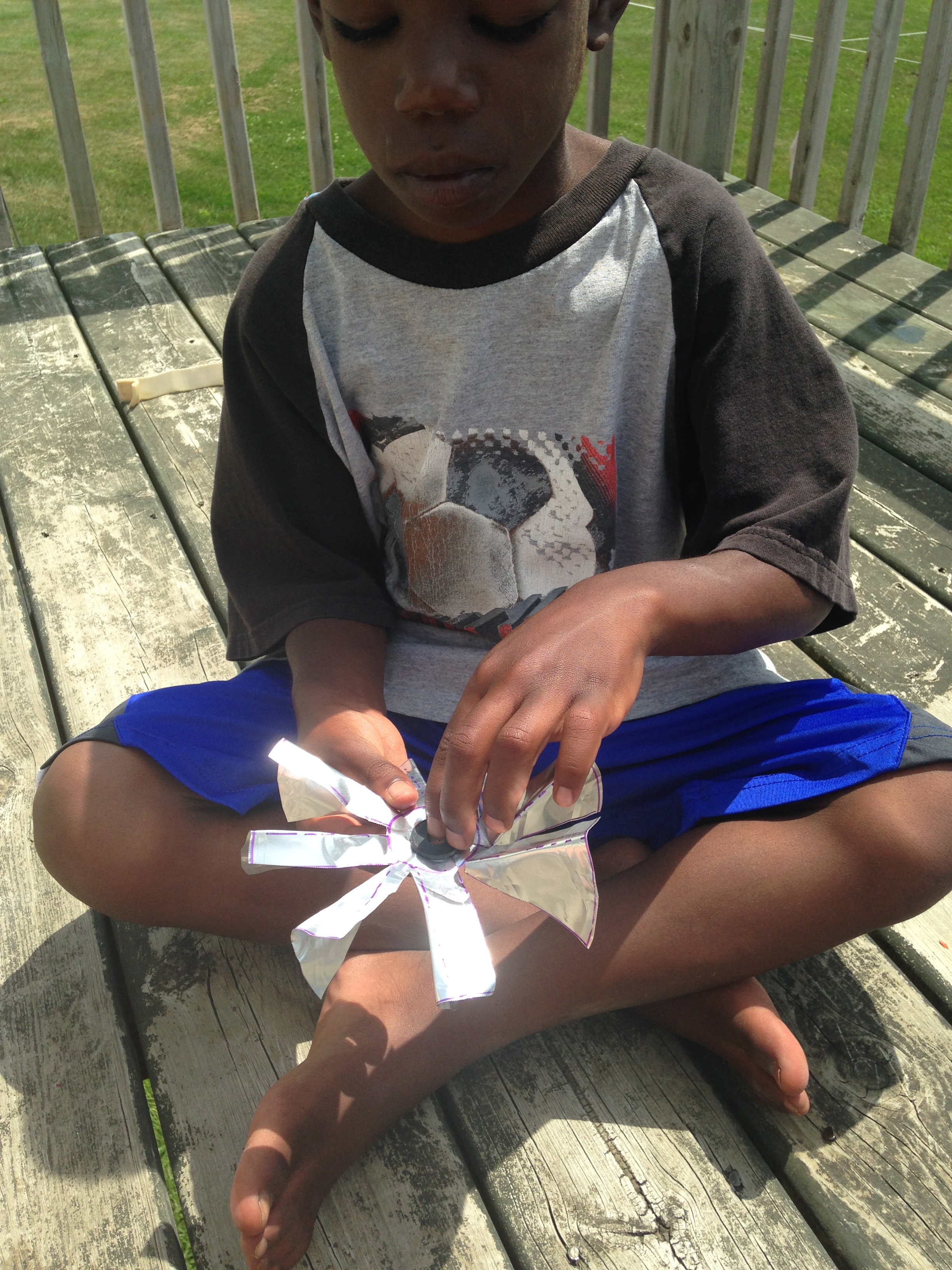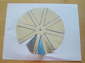 Step 1. Cut a circle out of the pie tin bottom. Then punch or cut a hole in the center roughly the size of the dowel rod. Use a marker to divide the tin as shown in the image where the dotted lines represent fold lines and solid lines represent cut lines.