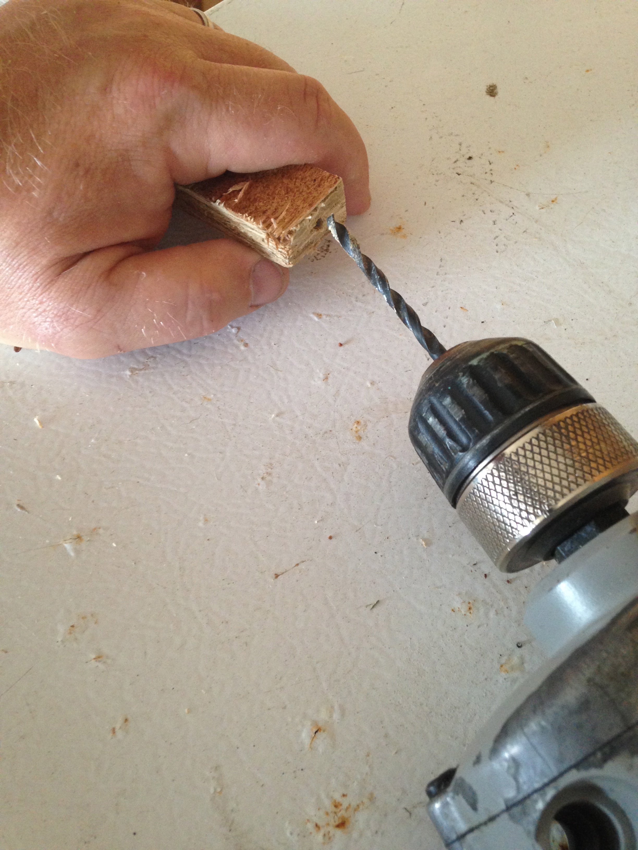 Step 2: (Adult helper) Drill about a 3/8″ hole in the center of one of the pieces of wood. (wood should be about 1″ wide by 12″ long).