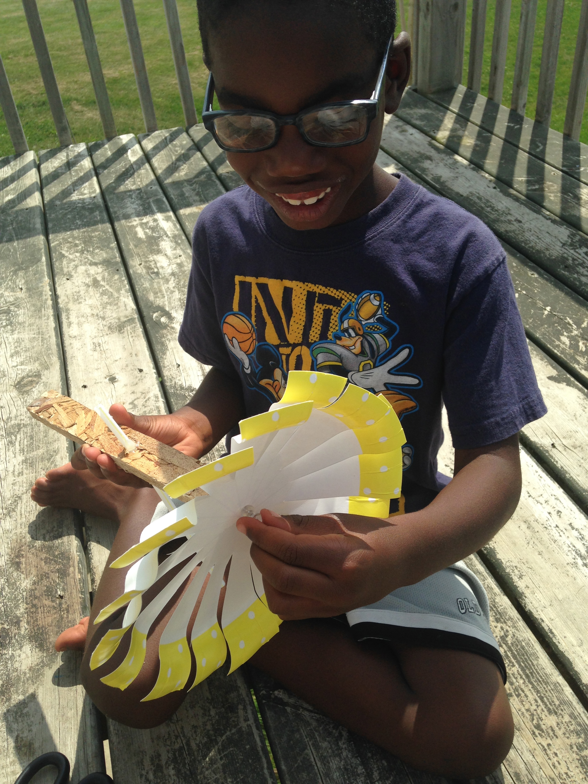 Step 6: Connect your two pieces of wood by carefully slipping the straw over the skewer. Watch your wind turbine blow in the wind!